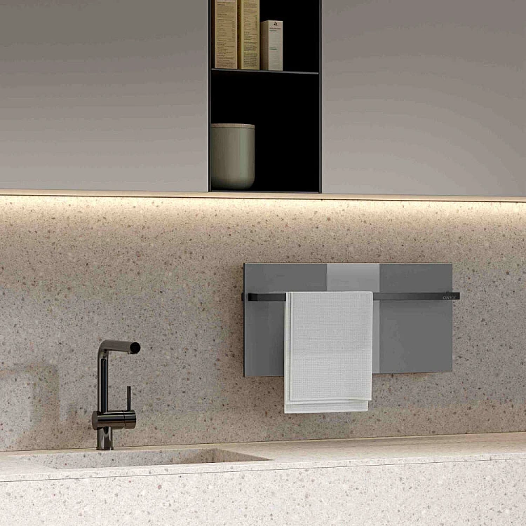 Рушникосушка з сенсорним керуванням. Модель 1K – ексклюзивна модель рушникосушки ONYX для кухні. Завдяки своїм пропорціям і функціональності ONYX 1K чудово підійде до будь-якого дизайну інтер’єру та розміру кухні. Конструкція:Електрична рушникосушка ONYX виготовлена з гартованого скла. Це забезпечує високу міцність і безпеку. Нагрівальний елемент рівномірно розміщується між склом та корпусом без доступу повітря й вологи. Для виготовлення рейлінгів використовується нержавіючий полірований профіль. Товщина виробу становить лише 8 мм. Ультратонкий дизайн підкреслює унікальний зовнішній вигляд. ONYX – стильна, надійна та довговічна рушникосушка. Її монолітність гарантує тривалий термін експлуатації. Для виготовлення рейлінгів використовується нержавіючий полірований профіль прямокутної форми. Геометричний дизайн надає впізнаваності продукції сімейства HYBRO. Принцип роботи: ONYX – це абсолютно новий продукт у сегменті рушникосушок виробництва компанії HYBRO. Окрім унікального, зважаючи на виконання, дизайнерського предмета інтер’єру, він виконує дві основні функції. Перша - висушування рушників та інших текстильних виробів. Надійну експлуатацію забезпечують міцні кріплення ONYX, які витримують вагу кількох важких рушників. Друга функція – опалювальна. Рушникосушка є повноцінним опалювальним приладом для ванної кімнати. Вона розігрівається до 60 градусів за Цельсієм та працює у довгохвильовому діапазоні 7-14 мкм. Рівномірний нагрів поверхні ONYX забезпечує інфрачервоний потік, який у поєднанні з конвекцією є ефективним джерелом тепла. Рушникосушки ONYX мають два типи управління: сенсорне й аналогове. Принцип їх робити є ідентичним. Управління здійснюється сенсорною кнопкою, яка розташована на лицьовій поверхні або кнопкою на контактній групі. Режим роботи розділений на три температурні рівні. Якщо в будь-якому режимі утримувати сенсор/кнопку, вмикається таймер – рушникосушка працюватиме в режимі 100% потужності протягом трьох годин.