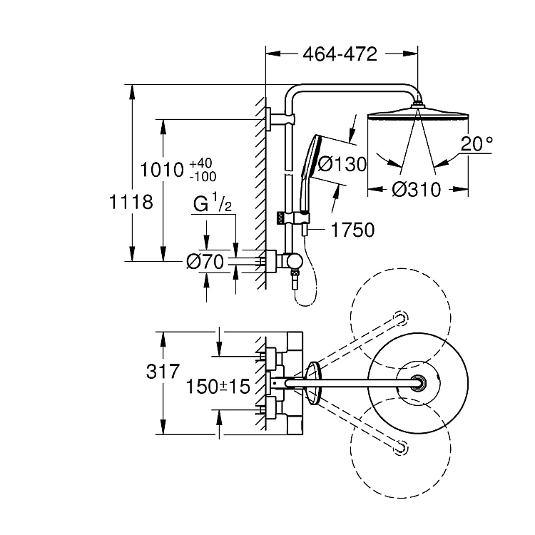 Отримайте AI поради по Душова система із термостатом для настінного монтажу GROHE Rainshower SmartActive 310, матове золото, 26836GN0