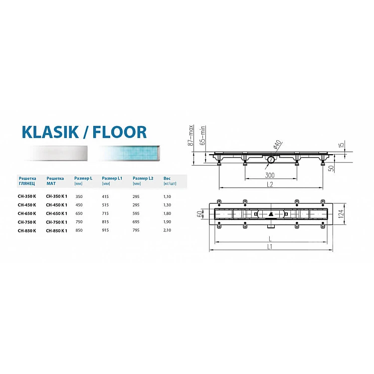 Душовий канал MCH (CH-350 K) з решіткою "Класік/Під плитку" з горизонтальним фланцем. Два дизайна в одному виробі за рахунок двосторонньої дизайн-вставки (з одного боку - нержавіюча сталь, з іншого боку - порожниста під плитку); Матеріал корпусу - модифікований поліпропілен і нержавіюча сталь, матеріал решітки - нержавіюча сталь. Товщина сталі решітки - 1,5 мм, пропускна здатність - 0,63 л/с. Монтажна висота - 65-87 мм. Довжина L - 350 мм (видимої частини), довжина L1 - 415 мм (загальна), максимальне навантаження 300 кг. Унікальна конструкція каналів МСН забезпечує швидкий і зручний монтаж, а висоту ніжок можна легко коригувати зверху навіть після встановлення каналу.