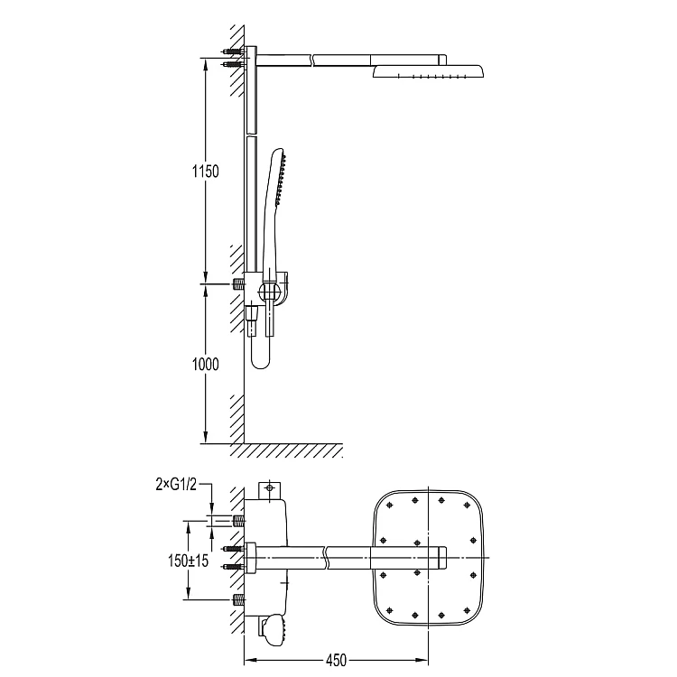 Душова система з термостатом для душу матеріал лійки ручного душу: ABS-пластик матеріал змішувача, лійки верхнього душу, душової штанги: латунь термостатичний картридж Vernet (Франція) із запобіжником на 38°C латунний кнопковий механізм Smart Click з кнопковим перемиканням можливість одночасної роботи захист від зворотного потоку висота душової колони: 1150 мм не регульована довжина кронштейна 440 мм кількість функцій ручного душу: 1 кількість функцій верхнього душу: 2 (Тропічний душ, Тропічний душ Air-Mix) душовий шланг PVC, G1/2", 150 см, Anti Twist верхній душ, розбірний, 250х200 мм матеріал форсунок LSR (м'який силікон) регулювання нахилу верхнього душу +/- 20° під'єднання G1/2", фільтр грубого очищення, захист від зворотного потоку загальний витрата води- до 45 л/хв. води: 1-5 бар поверхня хром