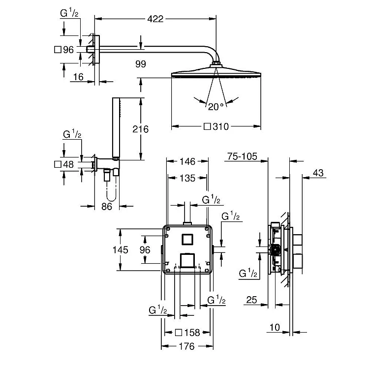 термостатичний змішувач прихований монтажу для душу на 2 виходи з вбудованим запірним клапаном (24 154) універсальна вбудована частина GROHE Rapido SmartBox, 1/2" (35 604) набір з верхнім душем Rainshower Mono 310 Cube (26 563), включає душовий кронштейн 422 мм (26 145) ручний душ Euphoria Cube Stick, 1 режим струменю (27 698) відведення для душу 1/2" з тримачем (26 659) душовий шланг Silverflex 1500 мм 1/2" x 1/2" (28 364) опціональний регулятор потоку 9,5 л/хв для ручного душу та верхнього душу в комплекті