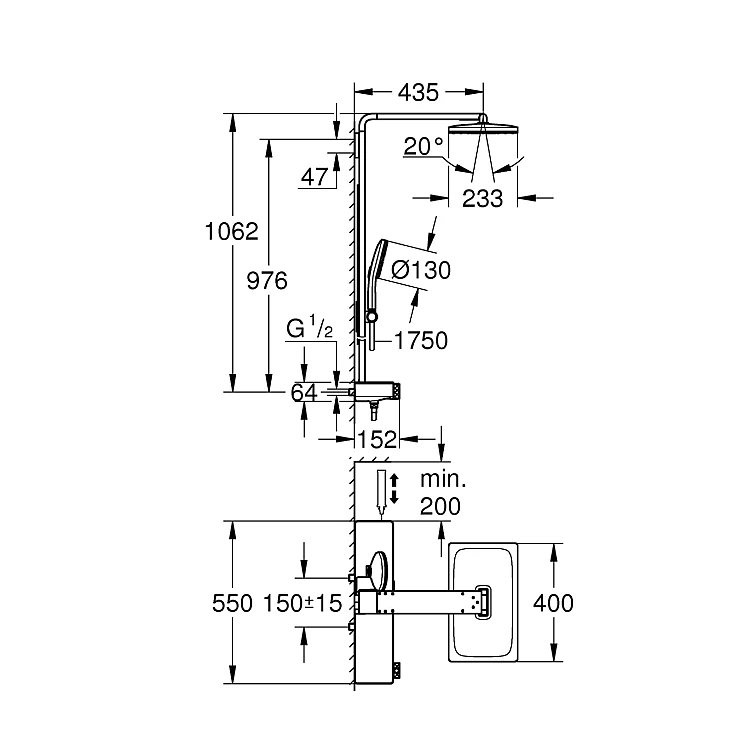 Термостат GROHE забезпечує стабільну температуру води навіть при перепадах тиску, гарантуючи безпеку та комфорт під час використання. Верхній душ створює ефект м’якого тропічного дощу, а ручний душ дозволяє обрати оптимальний режим струменю для релаксу або активного масажу.