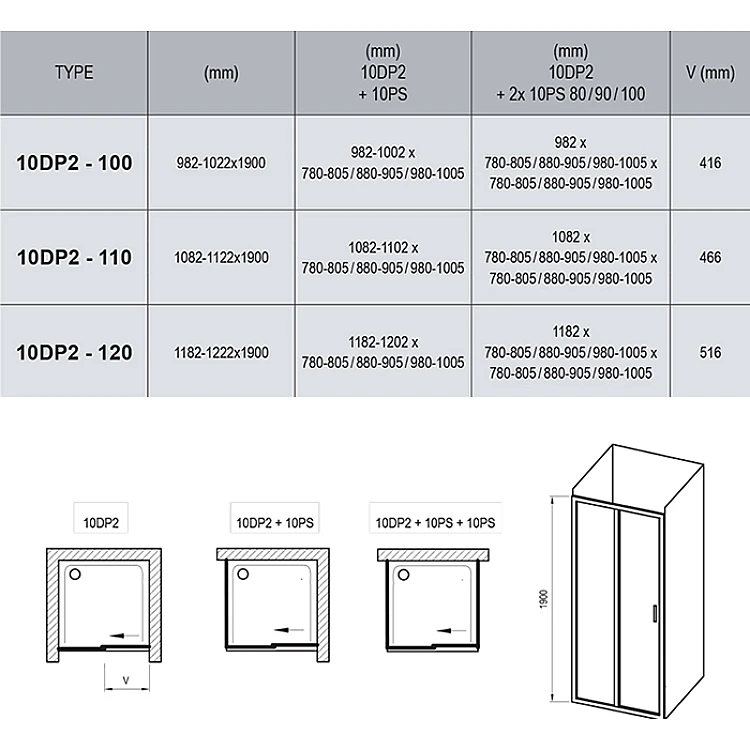 До комплекту входить: нерухома стінка та одні складні двері. Встановлюється до облицьованого кутка ванної кімнати (ідеально підходить для вбудування у нішу або в комбінації з нерухомою стінкою 10PS) на піддон RAVAK Perseus 10°, Perseus Pro Chrome, Perseus Pro Flat, Perseus Pro, Perseus, Gigant Pro 10°, Gigant Pro Chrome, Gigant Pro Flat, Gigant Pro, Gigant або безпосередньо на підлогу з вбудованим каналом або трапом. Поєднання душових дверей з двома фіксованими стінами типу 10PS створює душ у формі "U". Використовуючи регулюючий профіль BLNPS, виріб можна збільшити на 20 мм.