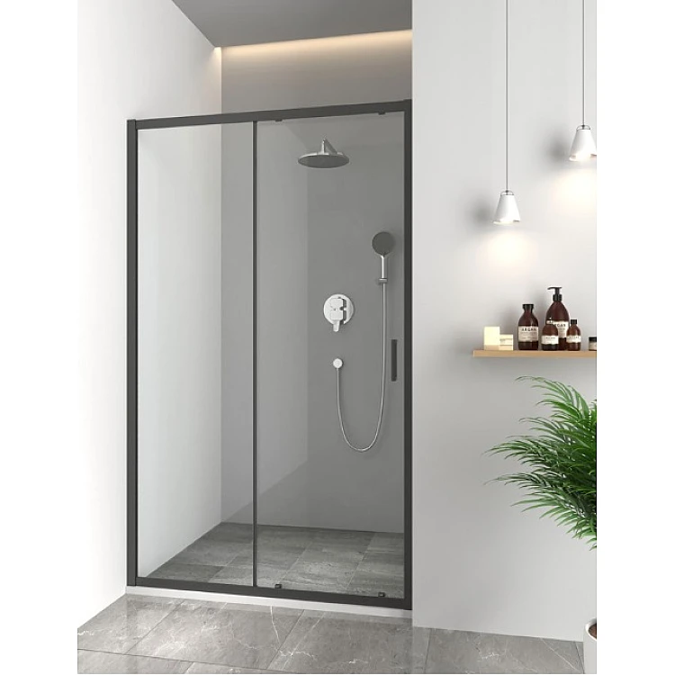 Прозоре скло надає відчуття простору та легкості, роблячи ванну кімнату світлішою та просторішою. Чорні матові профілі додають дверям сучасного вигляду, підкреслюючи їхній елегантний дизайн і забезпечуючи стійкість до корозії. Розсувний механізм дверей працює плавно, дозволяючи економити простір, що робить їх ідеальним вибором для компактних приміщень. Ці двері підходять для встановлення у душові ніші або в поєднанні з іншими елементами, створюючи стильну та функціональну душову зону.