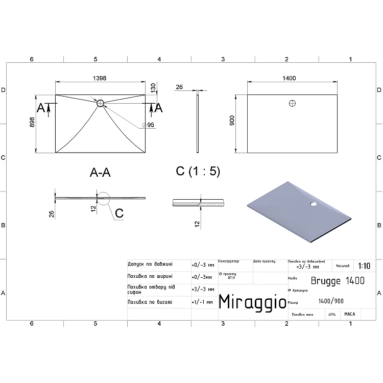 Характеристики - Душовий піддон MIRAGGIO BRUGGE 1400