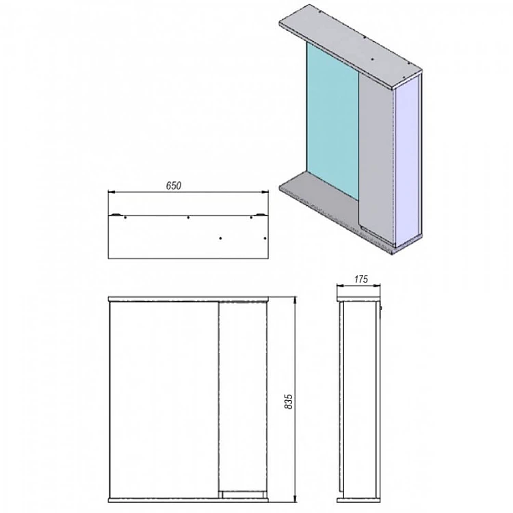 Основа, на яку наклеєне дзеркальне полотно, а також боковини виготовлені з ламінованого ДСП товщиною 16 мм, фасадна частина та верхня і нижня панелі з МДФ одностороннього ламінування товщиною 16 мм.