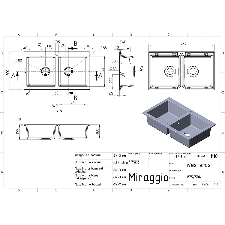 Характеристики - Кухонна мийка MIRAGGIO WESTEROS жасмин