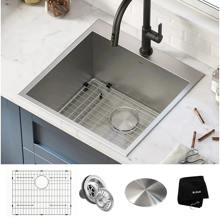 Кухонна мийка з нержавіючої сталі з прямими стінками і кутами малого радіусу додасть вашій кухні сучасний вигляд. Зручна конфігурація з подвійним способом кріплення дозволяє встановлювати її як нижнім, так і верхнім способом монтажу, що робить її сумісною з будь-яким типом кухонної стільниці. Мийка виготовлена вручну з високоякісної нержавіючої сталі марки T304, має пологе дно і спеціальні канавки, що забезпечують чудовий дренаж.