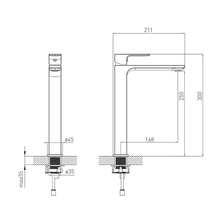 Дизайн виробу відповідає сучасним тенденціям у сфері інтер'єрів ванних кімнат та основним вимогам ергономічності. Змішувач спроектований відповідно до концепції ТМ Volle і тому чудово поєднується з більшістю колекцій сантехніки. Використання як матеріал змішувача латуні гарантує багаторічну безпроблемну роботу, а надійний керамічний картридж сприяє зручному регулюванню температури та економії води. Аератор легко знімається без використання спеціальних інструментів. Даним змішувачем можна комплектувати раковини Volle з отворами під змішувач.