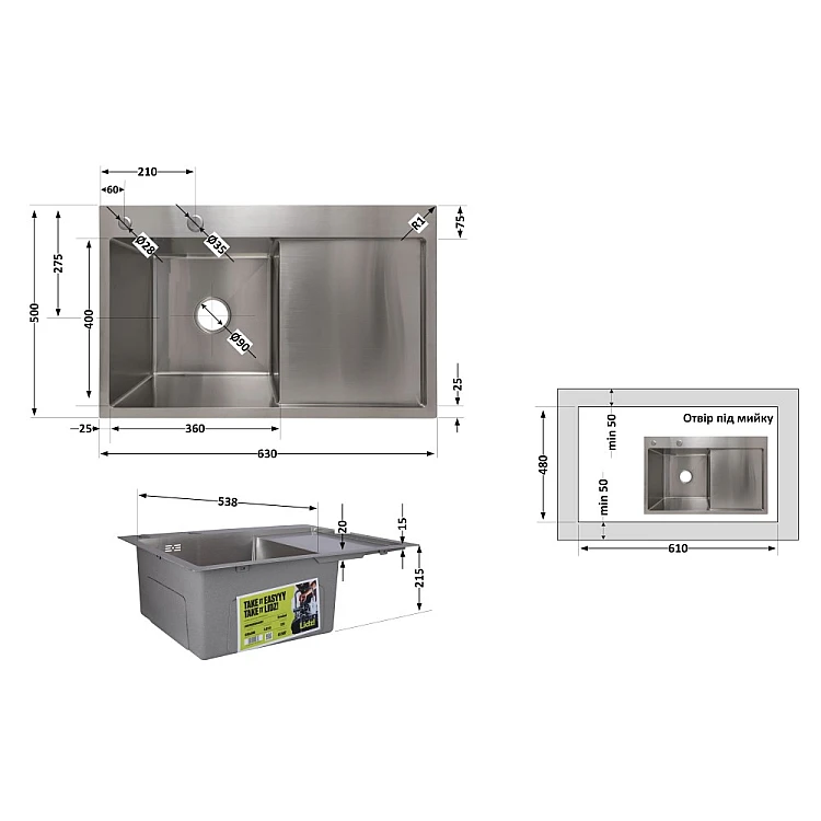 Мийка для кухні Lidz Handmade H6350R крило праворуч LDH6350BRUR45587 Brushed Steel з дозатором