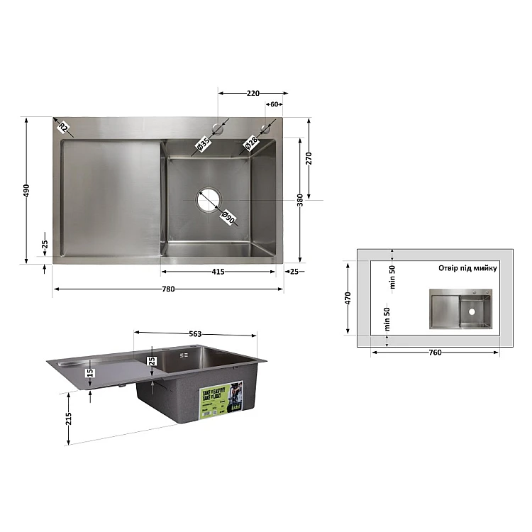 Мийка для кухні Lidz Handmade H7849L крило ліворуч LDH7849BRUL45592 Brushed Steel з дозатором