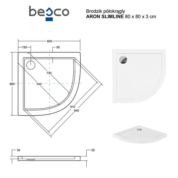 Опис товару - Душовий піддон напівкруглий BESCO ARON 80х80х3/5.5 см