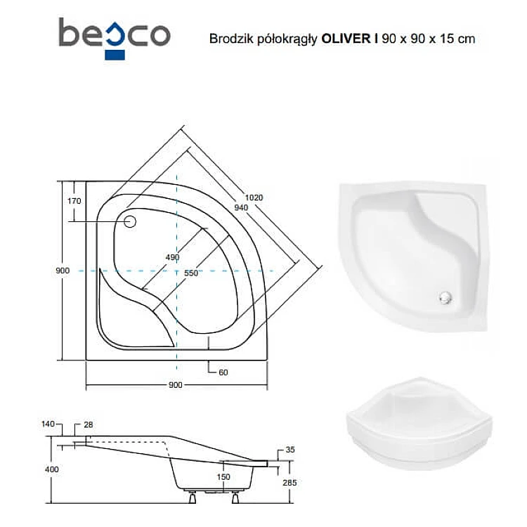 Душовий піддон напівкруглий BESCO OLIVER 90Х90Х15/25 + ноги