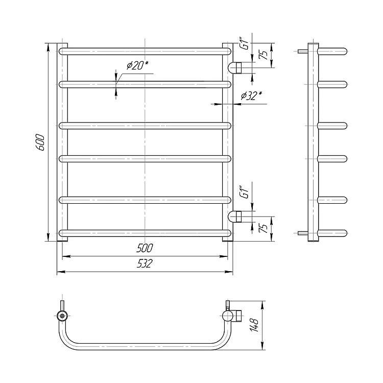 Водяна рушникосушка Стандарт Б/П 1" 600х500 з міжосьовою відстанню для підключення 500 мм, діаметр підключення G 1/2 '' складається з 5 ребер. Рушникосушка Стандарт Б/П 1" підприємства Mario виготовлена з нержавіючої сталі АІSI 304 може бути обладнана електричним теном.