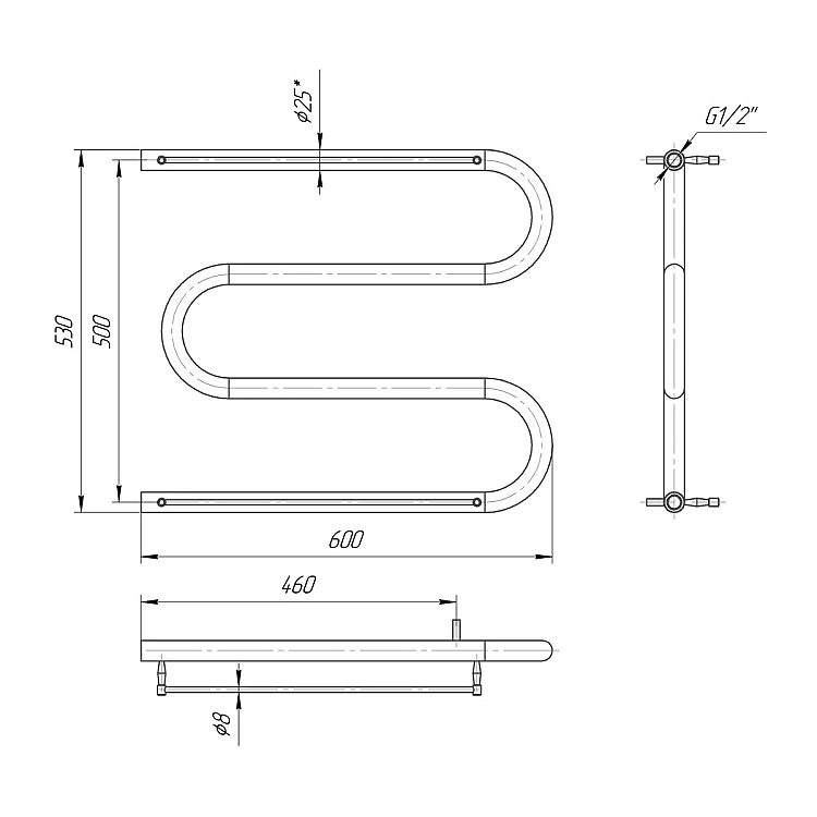 Водяна рушникосушка Mario Змійка ∅25 з полицею 525x600/500 mar_162