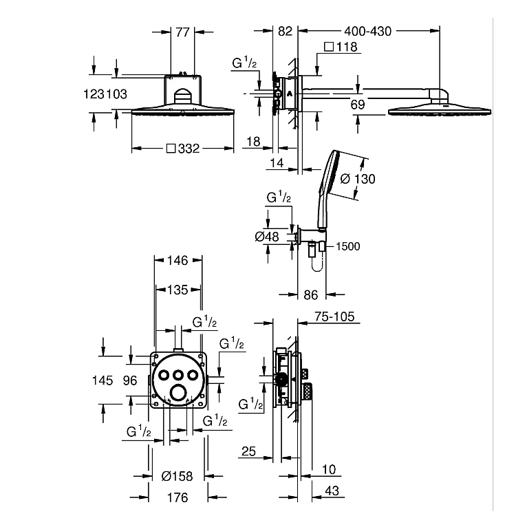 GROHE Grohtherm SmartControl — прихована душова система преміум-класу з інтуїтивним кнопковим керуванням. Оснащена верхньою душовою лійкою Rainshower SmartActive 310, яка забезпечує рівномірний та комфортний потік води. Технологія SmartControl дозволяє легко вмикати та регулювати подачу води, а термостат GROHE TurboStat підтримує стабільну температуру під час використання. Система також включає ручний душ із кількома режимами струменя. Завдяки прихованому монтажу ідеально підходить для сучасних мінімалістичних інтер’єрів. Монтажна частина купується окремо.
