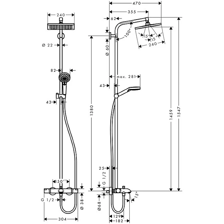 Характеристики - Душевая система для ванны с термостатом HANSGROHE Crometta E 240 27298000 хром