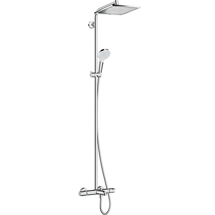 Душевая система для ванны с термостатом HANSGROHE Crometta E 240 (27298000), размер душевого диска: 240 x 240 мм, регулируемый угол верхнего душа, тип струи: Rain, расход воды для струи Rain (при 3 бар): 17 л/мин, полностью хромированный душевой диск, длина держателя для душа 350 мм, термостат Ecostat Comfort, расход воды для излияния на ванну: 20 л/мин, регулируемый ограничитель температуры горячей воды, вид монтажа: наружный монтаж.