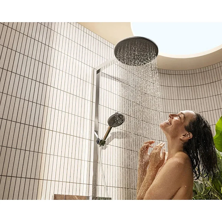 Душевая система Hansgrohe Raindance Alive S 300 1jet оснащена большой верхней лейкой диаметром 300 мм, которая создает эффект тропического дождя, обволакивая вас мягкими и равномерными каплями воды. Технология AirPower обогащает воду воздухом, обеспечивая необыкновенно приятные ощущения от каждого прикосновения. Благодаря функции QuickClean вы легко избавитесь от известкового налета, просто проведя пальцем по соплам. Интуитивная панель управления ShowerSelect Comfort позволяет выбирать нужный режим одним нажатием, создавая индивидуальный комфорт каждый раз. Надежная термостатическая система обеспечивает стабильную температуру воды, предохраняя от перепадов и нежелательного перегрева. Все элементы изготовлены из высококачественных материалов, что гарантирует долговечность и идеальный вид на протяжении многих лет.