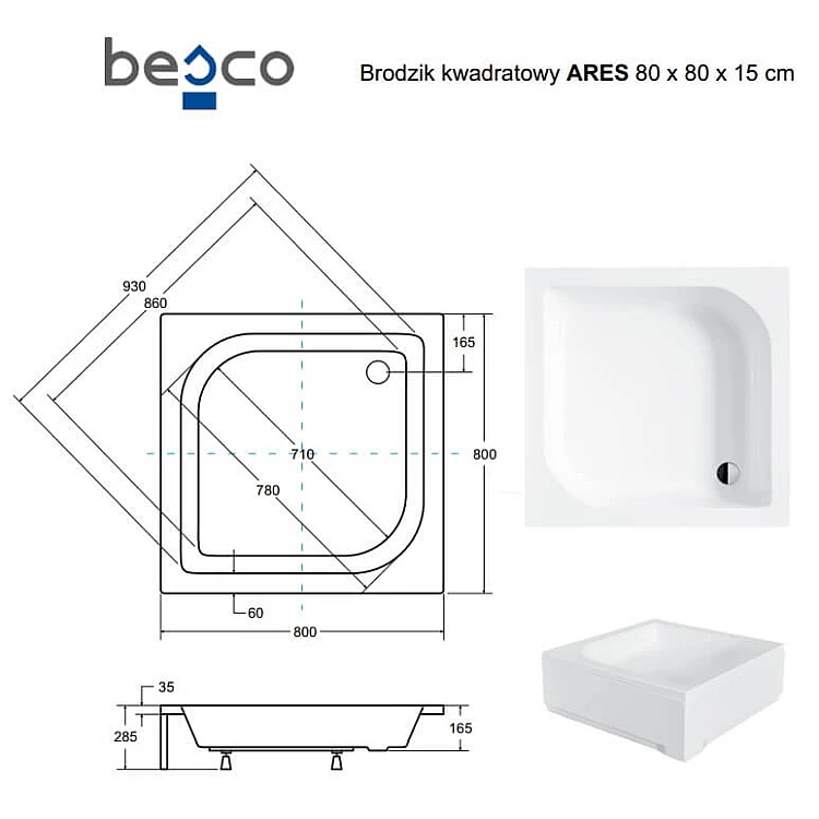 Описание товара - Душевой поддон квадратный BESCO ARES 80х80х15/25 см + ноги