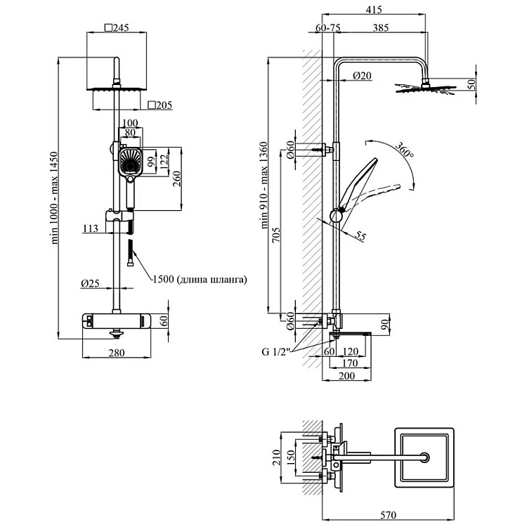 Монтаж осуществляется настенным способом, обеспечивая устойчивость конструкции. Высота душевой стойки регулируется от 910 до 1360 мм, что позволяет адаптировать ее под потребности каждого пользователя. Общая высота системы может варьироваться от 1000 до 1450 мм, ширина составляет 280 мм, а глубина — 570 мм.