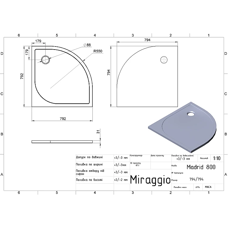 Характеристики - Душевой поддон MIRAGGIO MADRID 800