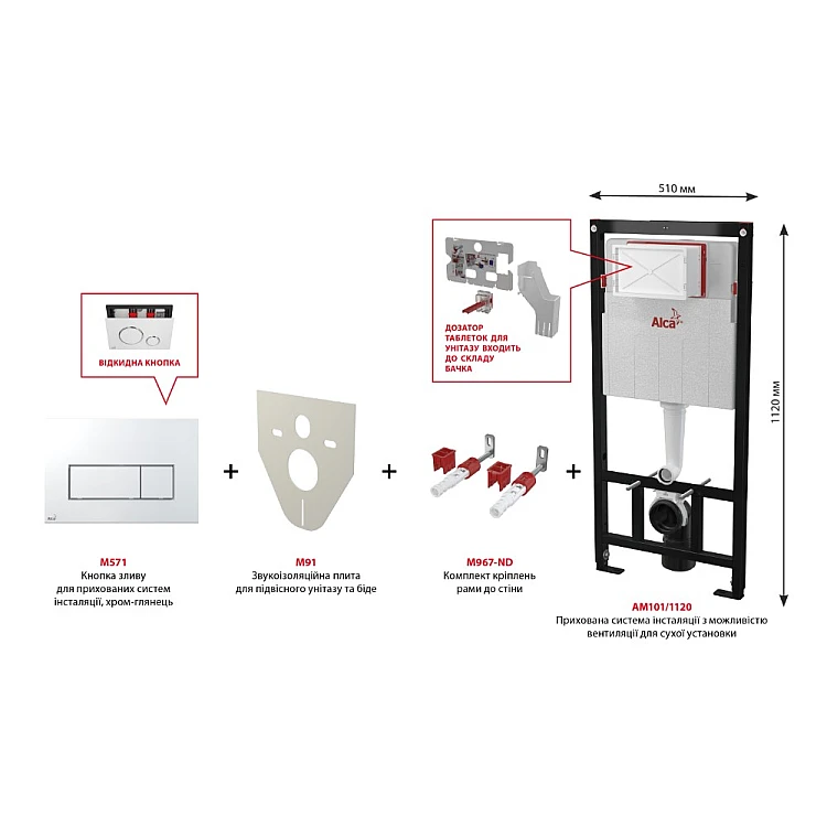 Инсталляция AM101/1120 с панелью смыва M571 и звукоизоляционной прокладкой M91 от компании Alca Plast предназначена для подвешивания унитазов с интервалом крепления 180 мм или 230 мм к гипсокартонновым конструкциям. Модель можно отнести к классу стандартных (универсальных) модулей без дополнительных конструктивных особенностей (таких как: малая высота, малая толщина и т.д). Инсталляция предназначена для сухой установки на заранее подготовленное место, имеющее подвод воды и канализационный отвод.