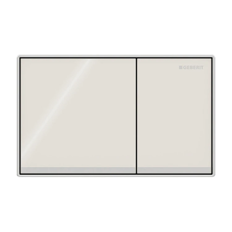 Клавиша, изготовленная из литого под давлением цинка, способна противостоять влажной среде ванной комнаты, коррозии и окислению. Поверхность из белого стекла декорирована яркой тонкой полоской и обрамляющей рамкой. Благодаря звукопоглощающим толкателям работа устройства абсолютно бесшумна.