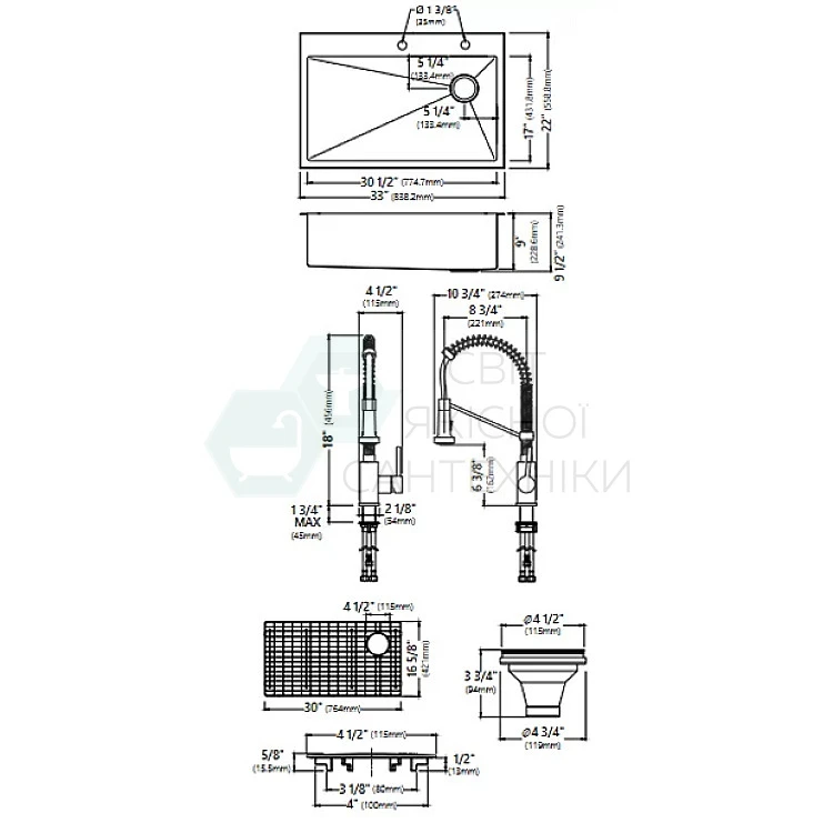 - В комплект входят: раковина KHT410-33, смеситель KPF-1610SFS, нижняя решетка KBG-T410-33 (безопасная для посудомоечной машины), сливной узел ST-1, съемная сливная крышка Cap STC-2, водоотводы, крепления и 2 шаблона. вырезание отверстий.