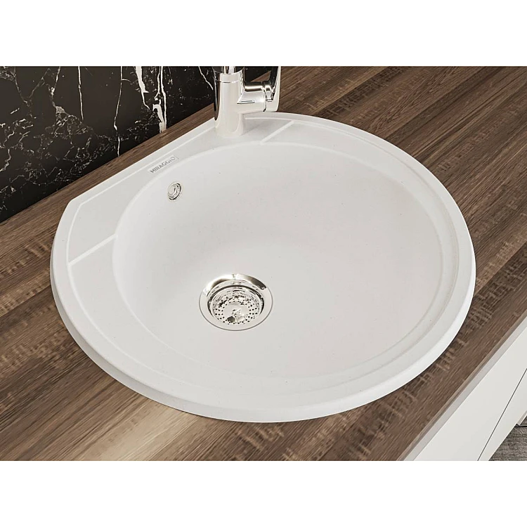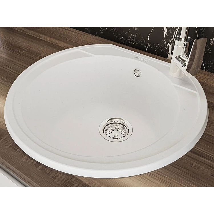 Круглая кухонная мойка TULUZA имеет однородную текстуру и цвет – белый. Количество чаш – 1. Тип установки – врезной. Материал мойки – Mirastone – не впитывает запахи, отталкивает жир и загрязнение, а также не изменяет цвета в процессе эксплуатации.