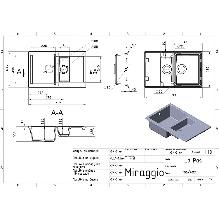Кухонные мойки MIRAGGIO комплектуются сифонами итальянского производства и крепежами для фиксации мойки. На все модели действует гарантия 10 лет от производителя.