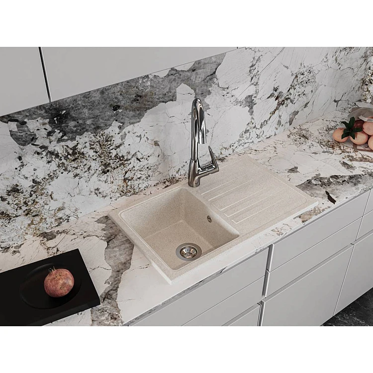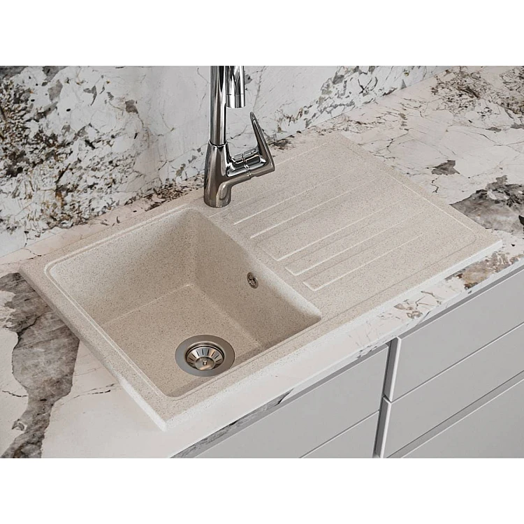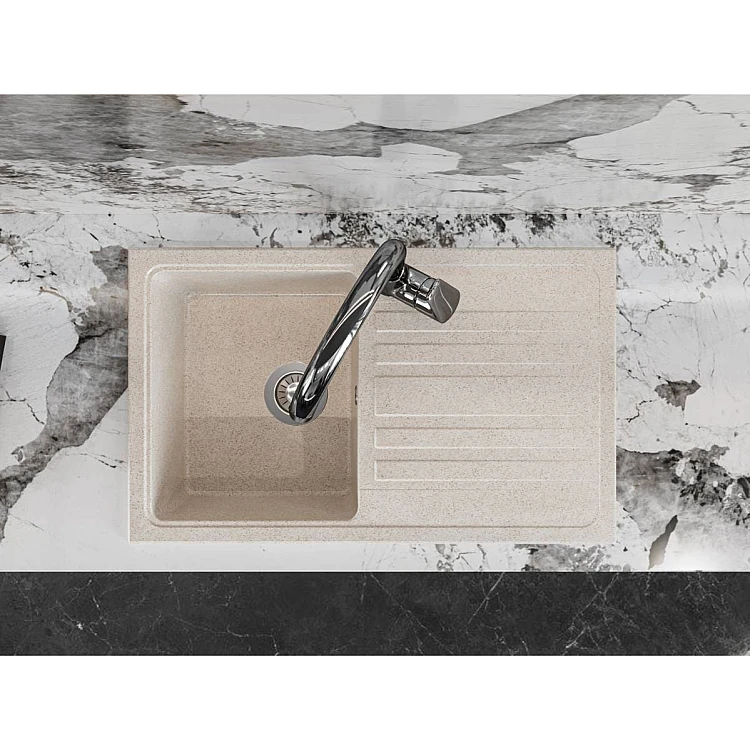 Кухонна мийка VERSAL sand на 80% состоит из кварцевого песка и на 20% из полиэфирной смолы, которая обеспечивает прочность этого изделия. Кухонная мойка выдерживает перепады температур от -70 до +70 °C и не поддается воздействию агрессивных бытовых красителей.