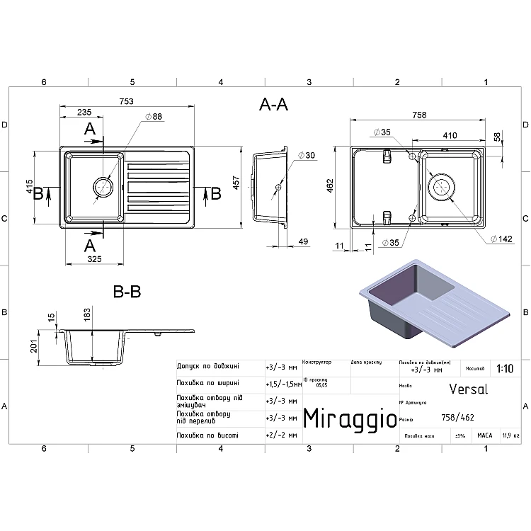 Кухонные мойки MIRAGGIO комплектуются сифонами итальянского производства и крепежами для фиксации мойки. На все модели действует гарантия 10 лет от производителя.