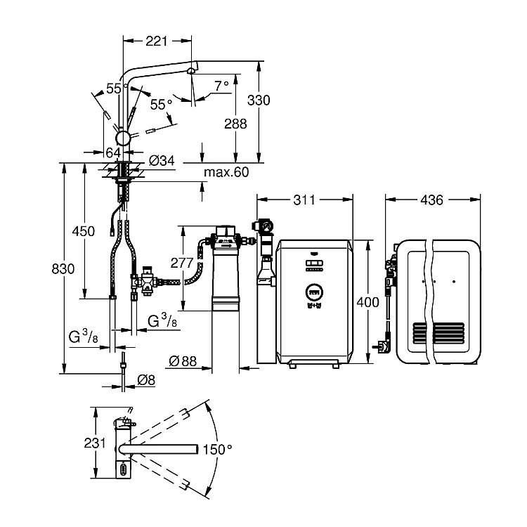 GROHE Blue Minta однорычажный смеситель для мойки с функцией очистки водопроводной воды монтаж на одно отверстие отдельная рукоятка для 3-х видов фильтрованной и охлажденной столовой воды негазированная, слабогазированная, газированная вентиль 1/2" покрытие GROHE Long-Life GROHE SilkMove 35 мм керамический картридж регулировка расхода воды вращающееся излияние плоскость вращения 150° отдельные внутренние водные пути для фильтрованной и нефильтрованной воды гибкие соединительные шланги GROHE Blue Cube охладитель-карбонизатор 270 Вт, 230 В, 50 Гц тип защиты IP 21 необходимые вентиляционные отверстия на дне кухонного шкафа GROHE Blue фильтр размера S, регулируемая головка фильтра GROHE Blue 425 гр баллон с углекислым газом (CO2-) минимальное рекомендуемое давление 2.0 бар