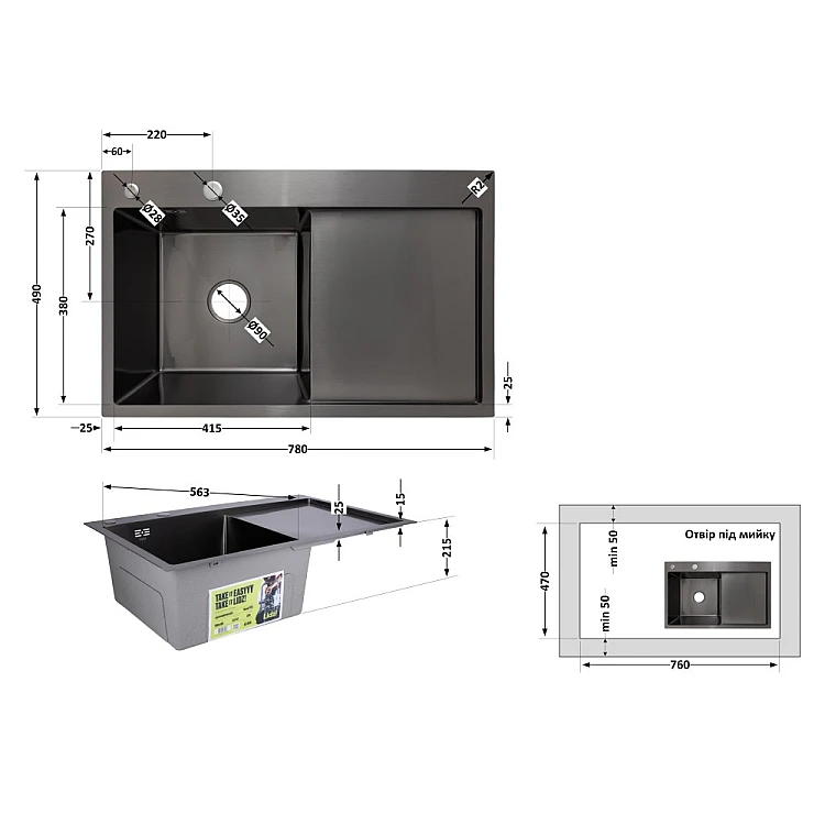 Мойка для кухни интегрированная Lidz Handmade H7849BR крыло справа (LDH7849BRPVD43625) Brushed Black PVD 3,0/1,0 мм