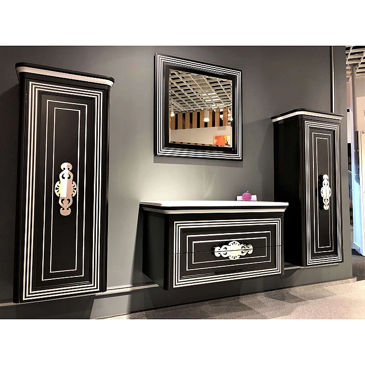 Корпус изготовлен из ламинированного МДФ цвета «Титан» толщиной 16 и 35 мм, фасады дверей – из ламинированного белого МДФ толщиной 19 мм, карниз – из МДФ толщиной 60 мм, задняя стенка – из ДВП толщиной 3,2 мм.