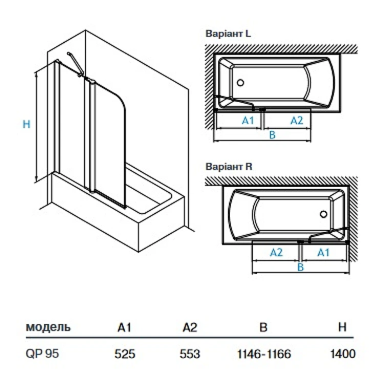 Шторка на ванную Koller Pool QP95 115x140 прозрачное стекло, правая