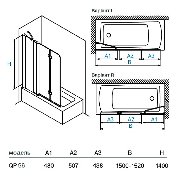Шторка на ванную Koller Pool QP96 115x140 матовое стекло, правая