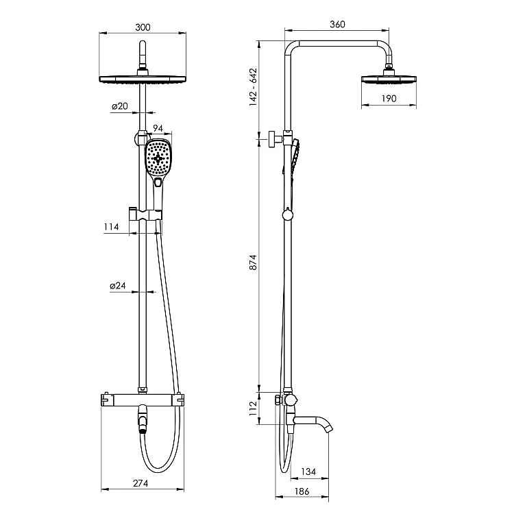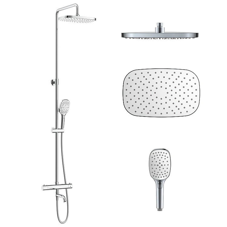 Душевая система с термостатом для ванны материал смесителя: латунь материал ручного душа, верхнего душа: ABS-пластик дизайн Bright Shine круглый термостатический смеситель для ванны, поворотный излив, обратные клапаны, фильтры грубой очистки, латунь, хром увеличенная круглая телескопическая штанга 1016-1516 мм, кронштейн 370 мм, хром регулируемый держатель лейки ручного душа на штанге овальный верхний душ 300х190 мм, крышка белый глянец, материал форсунок LSR (мягкий силикон), Self Clean овальная лейка ручного душа SPR252, размеры 94x115 мм, крышка белый глянец, 2 типа форсунок, материал форсунок LSR (мягкий силикон), кнопочный переключатель, обратный клапан, Self Clean количество функций ручного душа: 3 количество функций верхнего душа: 1 душевой шланг 170 см, PVC, Anti Twist общий расход воды до 25 л/мин рекомендуемое давление воды: 1-5 бар