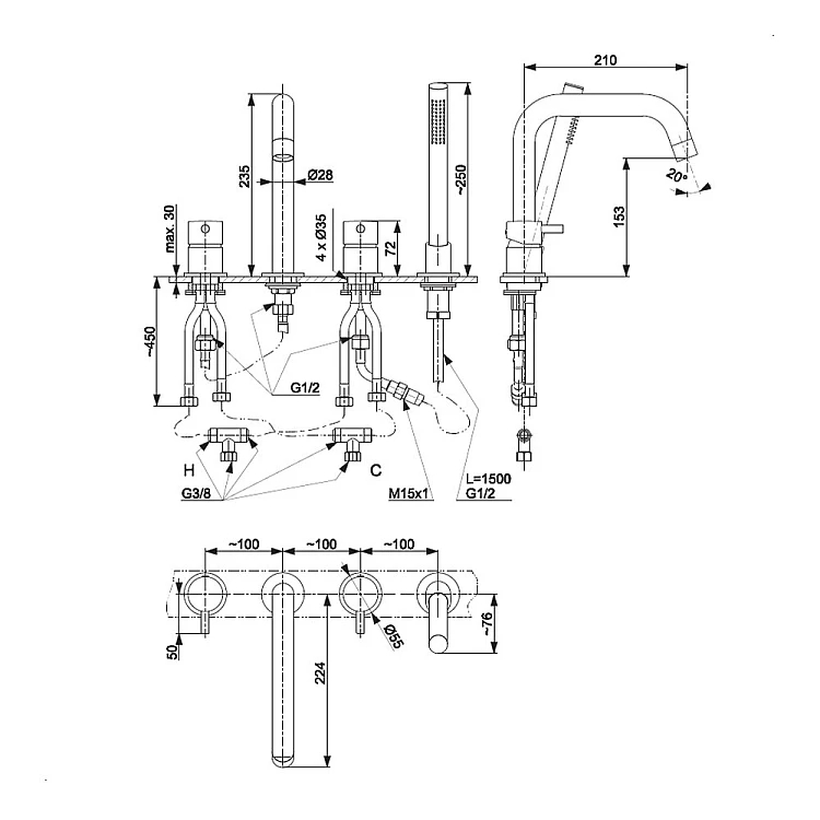Смеситель для ванны на 4 отверстия KFA ARMATURA MOZA 5035-210-31 золотой