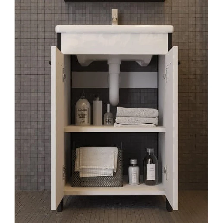 Тумба имеет две дверцы, внутреннее пространство за которыми разделено полкой, которая изготовлена из ДСП двустороннего ламинирования белого цвета толщиной 16 мм.