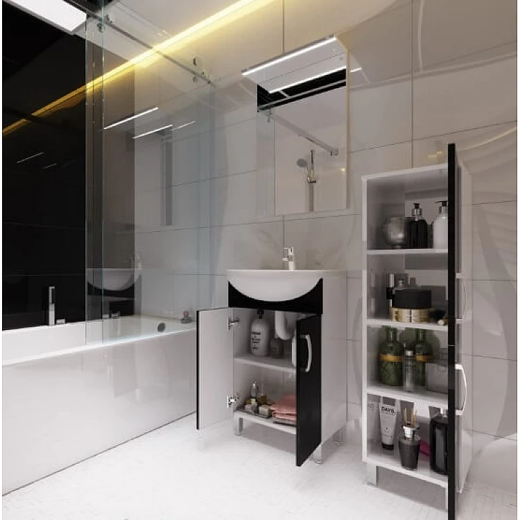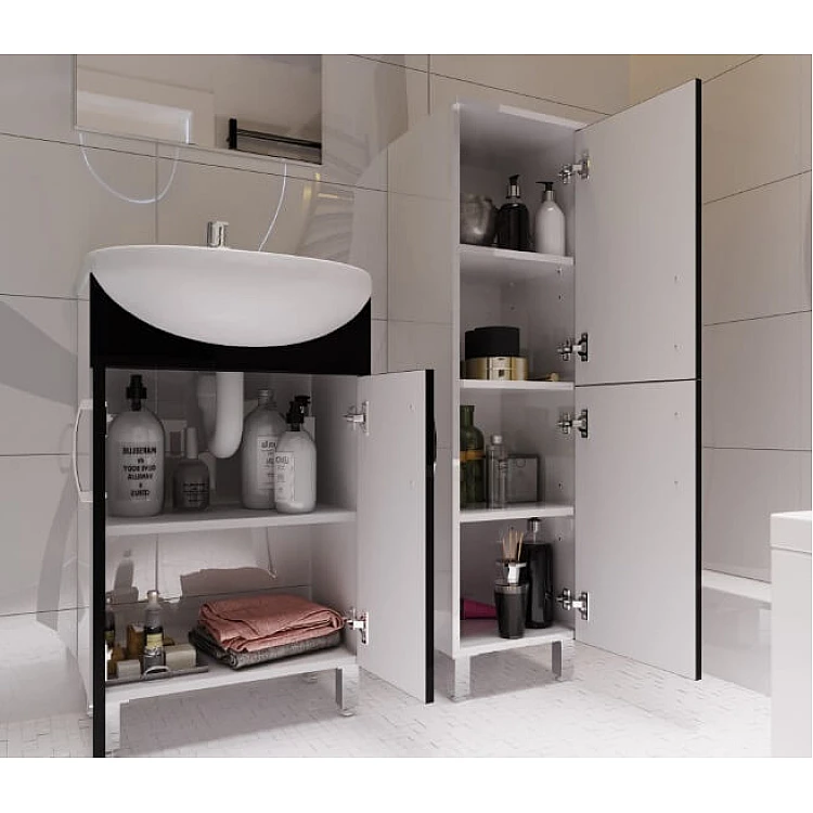Тумба имеет две дверцы, внутреннее пространство за которыми разделено полкой, которая изготовлена из ДСП двустороннего ламинирования белого цвета толщиной 16 мм.