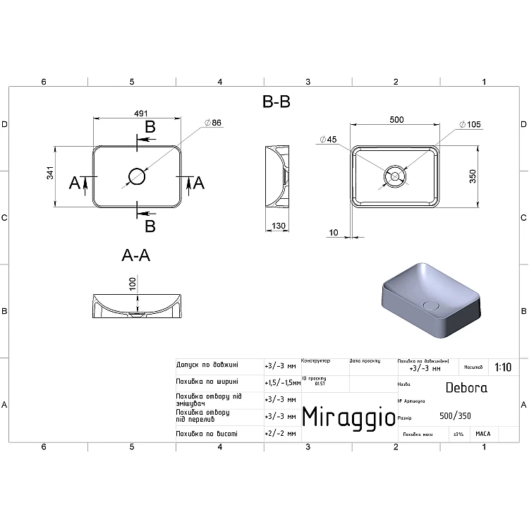 Характеристики - Умывальник MIRAGGIO DEBORA MIRASOFT белый матовый