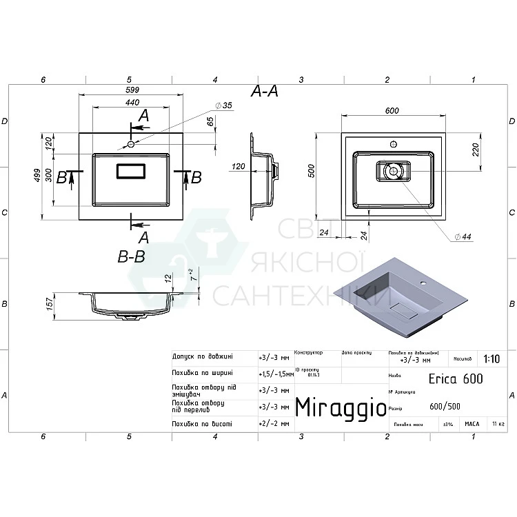 Характеристики - Умывальник ERICA 600 MIRASOFT