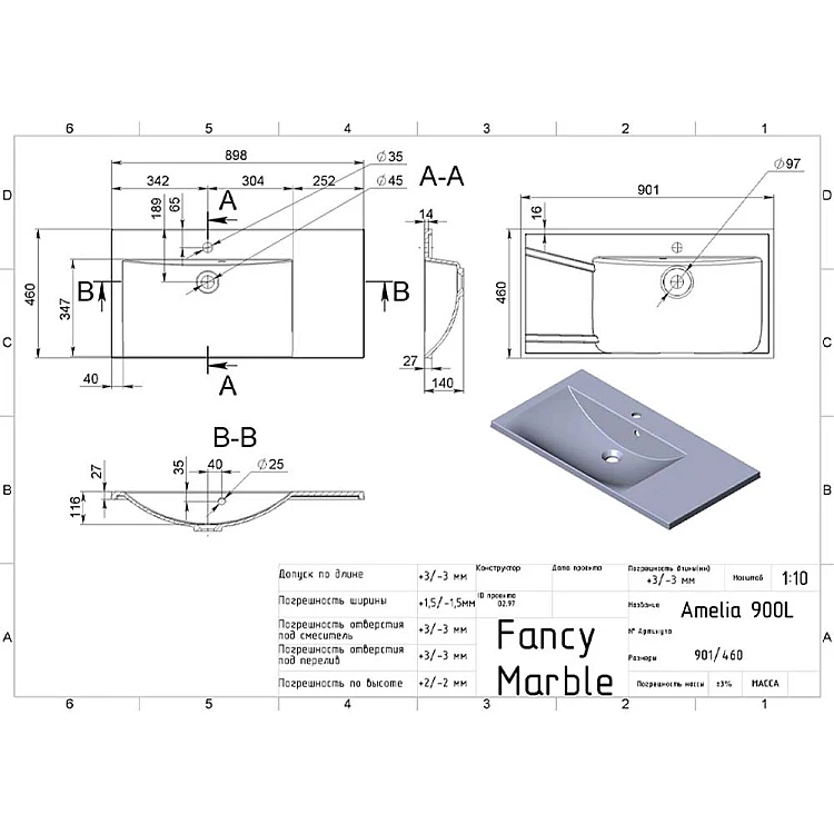 Умывальник Fancy Marble Edison 900 L/R из литого камня