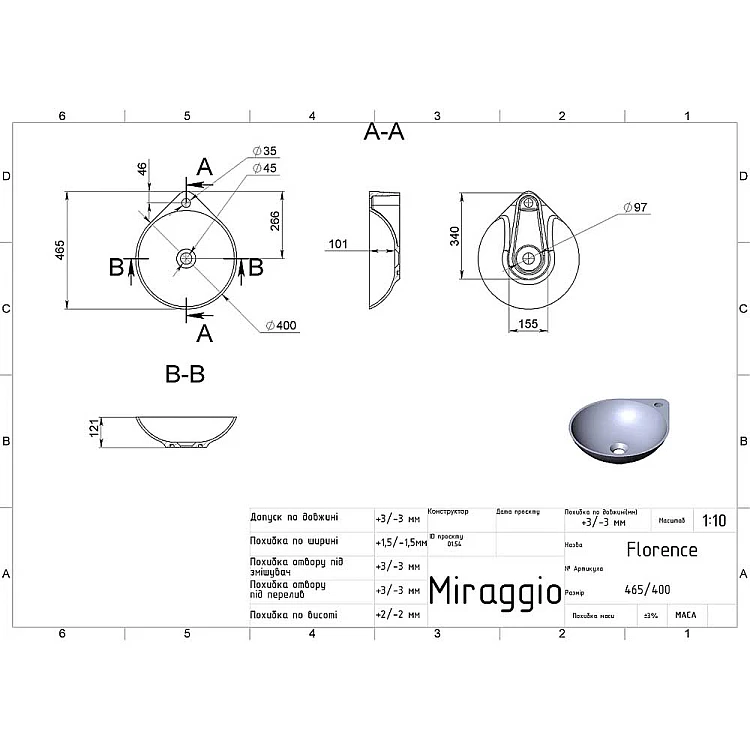 Умывальник Miraggio FLORENCE MATT 47x40 из литого камня