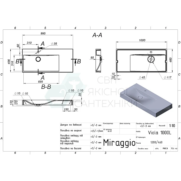 Характеристики - Умывальник VIOLA 1000 L