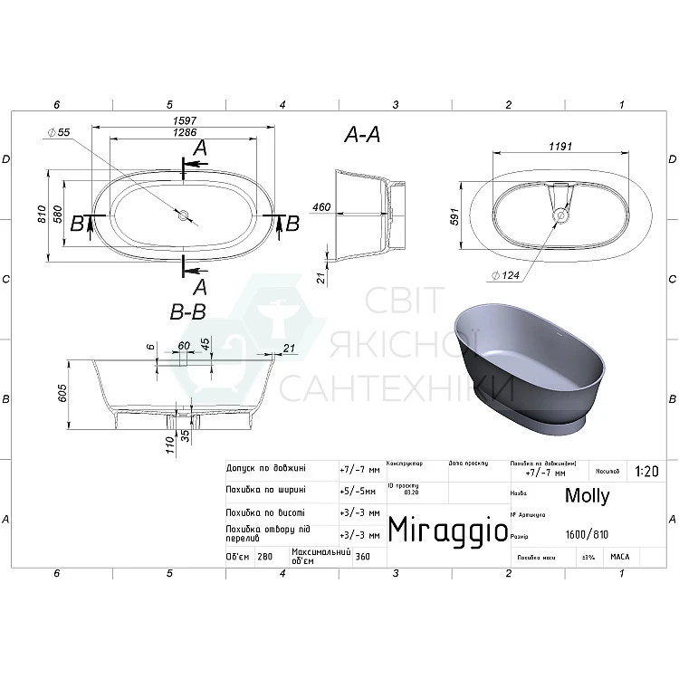 Характеристики - Ванна отдельностоящая MIRAGGIO MOLLY Miramarble Matt 160x81 белая матовая