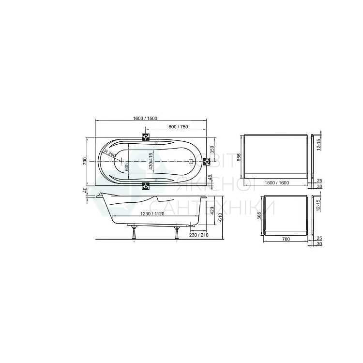 Дополнительные аксессуары: опора, передняя и боковая панели белого цвета, сточный комплект для ванн