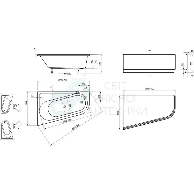Ванная асимметричная 170x105 Ravak Chrome CA41000000 R - правосторонняя